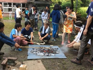我々が用意したのは、ワークショップ終了後の関係者パーティーだ。夕立の去った校庭には爽やかな涼が残り、それでも人々には熱気が冷めやまぬ。やまんBが準備してくれた、簡素であるが炭火を活かした思考がふんだんで嬉しい交流会に繋げられた。長谷沼夫妻も駆けつけていただけたのは嬉しかったし、矢部さん石川課長もソフトドリンクで居残って頂けました。様々に交流を深め、三々五々に解散していって、とても自然な成り行きに思えました。