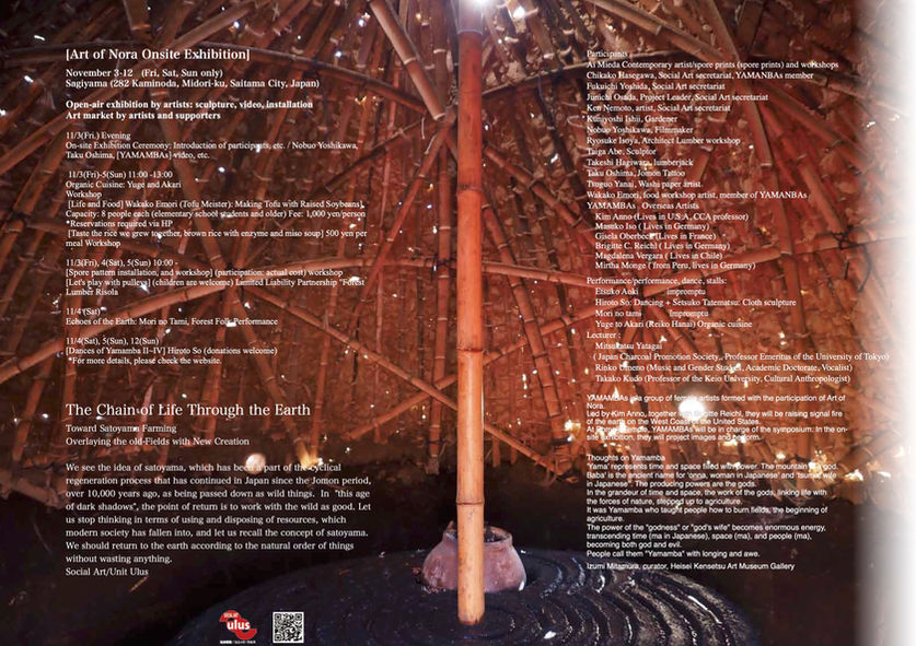 About Social Art/Unit Ulus The name 'Ulus' was first proposed by the artist, Hiromasa Tayga Abe when he was exhibiting in 2011 in the Mobile Museum, a touring exhibition project organised by the Museum of Modern Art Saitama, as a member of Social Art whose work was presented in a yurt. Abe felt then that what Social Art was aiming to achieve was the same as the concept of ‘ulus’, which in modern Mongolian means ‘nation’ but in the ancient language meant ‘vortex of people’, and defines a concept that refers to a self-sustaining assembly of people without borders.Considering the history of Mongoloid migration, it seems likely that this spirit was passed on to the Jomon people who settled in Japan and probably resides somewhere deep in our collective memory. It is a historical tendency towards self-reliance, independence, unity and maintaining of a certain level of trust. The Unit Ulus (vortex) aims to reflect, to share and to experience together the source of creativity, and to transmit wisdom, placing great importance on communication between people as they come into contact with nature through the earth. Art as a way of actively touching the world. It approaches gently and encourages you, providing you with strength to overcome obstacles. People connect with each other and amplify their energy like a vortex. It engages with society, sharing the power of art. Unit Ulus’s current activities are rooted in the community and combine the creativity of agriculture with the creativity of art. How ‘Art of Nora’ came about Social Art was established in 2002 at Fukuichi Yoshida's exhibition, ’Social Art Exhibition: THE Ichiba’ (ichiba means market in Japanese). At the time of its conception, the collective was simply named Social Art, using the term as a proper noun for the purpose of constructing the concept of social art. Between 2008 and 2010, Social Art defined social nature of art as social capital and exhibited works such as The Menko-ya Rokumondo, Pizza Mobile and Shichirindo (kitchen car) using seven rickshaws, collectively named Jiriki Koseisha (autonomous welfare cart). In 2011, Social Art created a unit within the collective, called Ulus, which practiced charcoal burning and focused on agriculture as a basis for life. After Unit Ulus created their first charcoal kiln work in 2011, they went on to produce charcoal clay works with water purification function, objects made from bamboo charcoal which also contributed to the maintenance of overgrown bamboo forests, and charcoal works made from various waste materials such as food residue. ‘Hut conferences’ were held in one of the three yurts constructed out of bamboo and the during the TANBO project in 2016, 20m long straw paper was made in rice paddies, led by Tsuguo Yanai. The participants became acutely aware that the key to solving the problems of modern society lies hidden in the way farming is carried out. At the same time, they conducted rice husk burning which is beneficial for the soil, in Niigata and Saitama, and made earthenware brazier. Unit Ulus has been organising various projects, such as on- site exhibitions and associated workshops, over the years. Since 2017, a charcoal kiln has been installed at an organic farm, Farm in Sagiyama in Saitama City, gradually expanding their activities. Around the same time, Unit Ulus also began working with Yuuki no Sato Towa in Fukushima prefecture, a village known as ‘home of organic farming’, and were able to experience the vitality of satoyama*(p3). The idea for the term ‘Art of Nora’ was suggested by head of the farm.